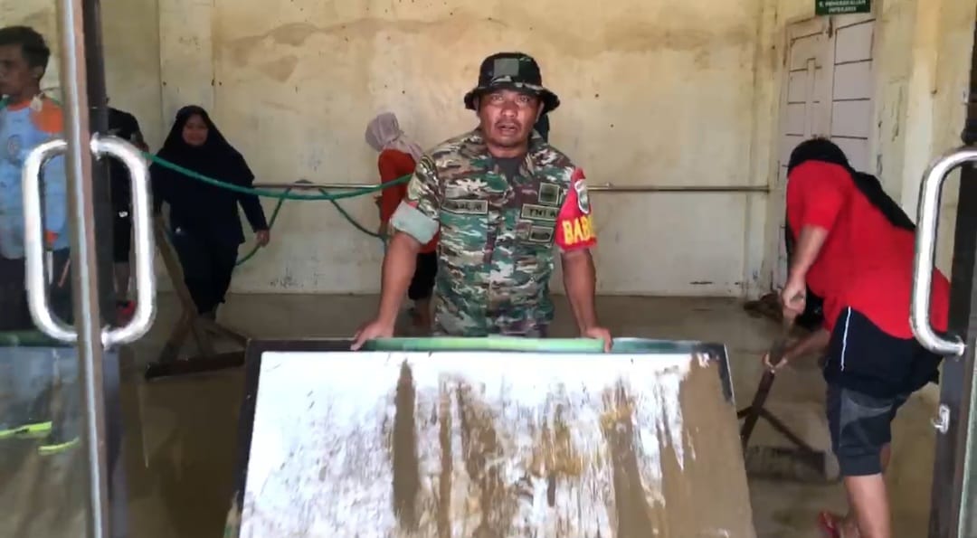 Suasana kebersamaan terlihat sangat kental saat personel Babinsa bersama tim gabungan menyemprotkan air dan menyikat lantai puskesmas yang masih kotor. Dedikasi tinggi ini menjadi bukti nyata kesiapsiagaan TNI dan instansi terkait dalam merespons cepat setiap dampak bencana yang merugikan fasilitas publik di wilayah tugas mereka.