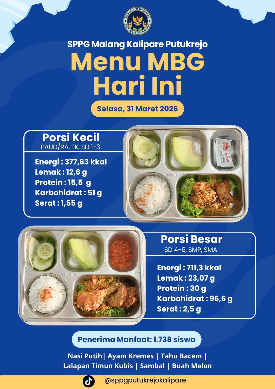 Menu MBG hari ini terdiri dari nasi putih, ayam kremes, tahu bacem, lalapan timun dan kubis, sambal, serta buah melon sebagai pelengkap. Menu tersebut disusun dengan memperhatikan keseimbangan gizi, mulai dari karbohidrat, protein, lemak, hingga serat, guna menunjang tumbuh kembang serta konsentrasi belajar siswa.