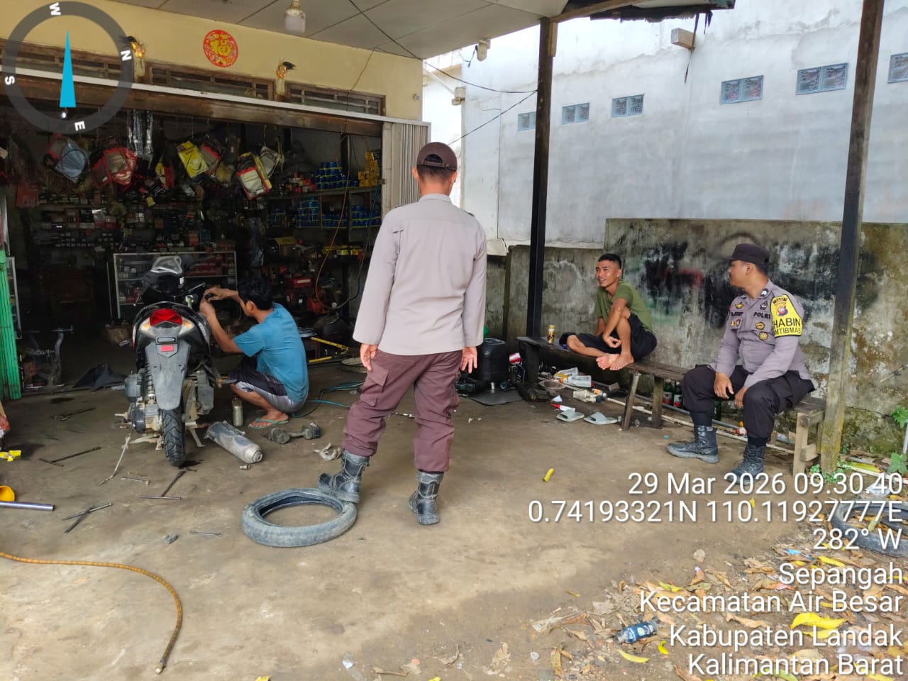 Polsek Air Besar ~ Polres Landak ~ Polda Kalbar ~ Suasana santai di sebuah bengkel motor di wilayah Kecamatan Air Besar mendadak terasa hangat dengan kehadiran aparat kepolisian yang melaksanakan patroli siang. Tidak hanya sekadar memantau situasi, anggota kepolisian juga menyempatkan diri berinteraksi langsung dengan warga, Minggu (29/3/2026).