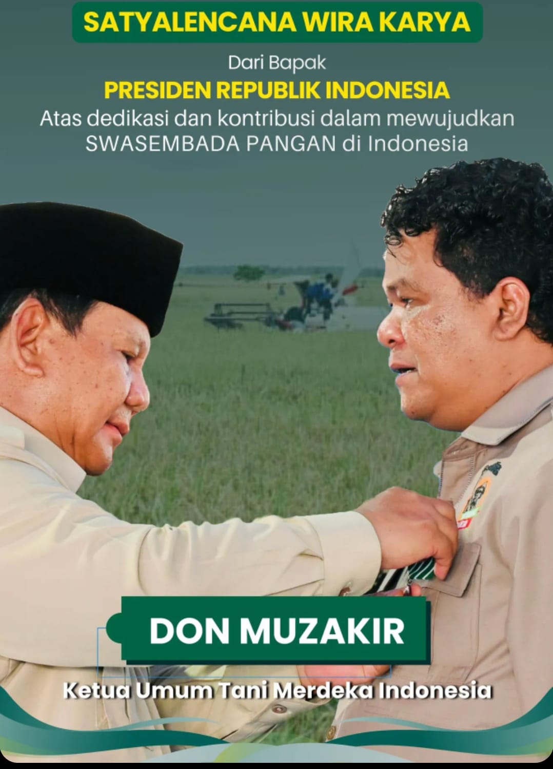 Don Muzakir salah satu penerima penghargaan Satya Lencana Wira Karya. Menurutnya, capaian swasembada pangan menjadi bukti nyata keberpihakan negara kepada petani.