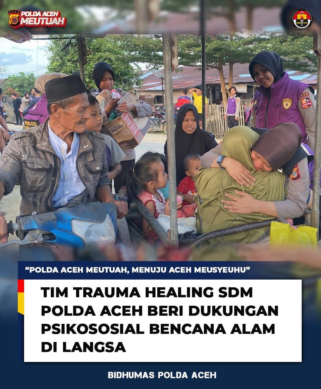 Kabid Humas Polda Aceh Kombes Pol. Joko Krisdiyanto, S. I. K, Sabtu, 6 Desember 20250, dalam keterangannya, menyebutkan Tim Trauma Healing Bagian Psikologi SDM Polda Aceh yang dipimpin Kasubbagsipol Kompol Raswan Effendi, S. Psi., M. Psi., Psikolog, bersama anggotanya melakukan kegiatan dalam rangka memberikan dukungan Psikososial Bencana Alam di wilayah Kota Langsa, serta bersama Tim Psikologi SSDM Polri dan Tim Polwan Mabes Polri.