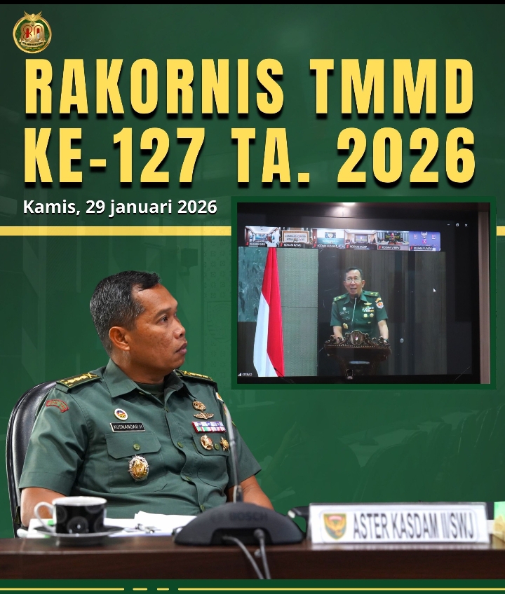 Palembang, Barometer99.com – Aster Kasdam II/Sriwijaya, Kolonel Inf Kusnandar Hidayat, S.Sos., menghadiri Rapat Koordinasi Teknis (Rakornis) TNI Manunggal Membangun Desa (TMMD) ke-127 Tahun Anggaran 2026. Kegiatan ini berlangsung pada Kamis (29/01/2026) bertempat di Ruang Puskodalopsdam II/Sriwijaya. Rakornis yang digelar secara daring ini dipimpin langsung oleh Waaster Kasad Bidang Binter, Brigjen TNI Boemi Ario Bimo, mewakili Aster Kasad Mayjen TNI Rachmad Zulkarnaen.