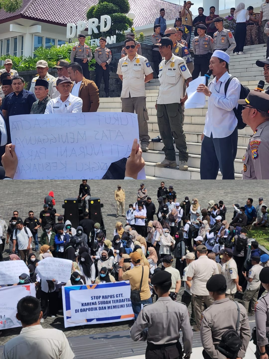 “Semua tuntutan yang disampaikan para guru honrer hari ini akan kami kawal secara kelembagaan. DPRD mendukung perjuangan bapak dan ibu guru honorer,” ucapnya.