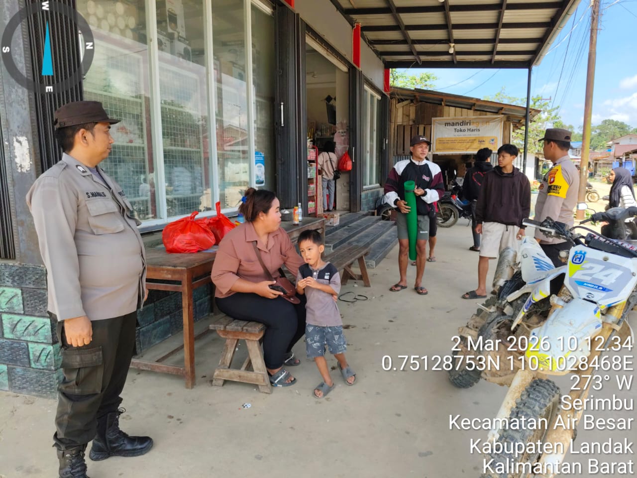 Polsek Air Besar ~ Polres Landak ~ Polda Kalbar, Barometer99.com ~ Suasana santai warga yang baru saja menyelesaikan aktivitas belanja di sebuah toko di wilayah Kecamatan Air Besar tampak berbeda pada Senin (2/2/2026). Saat warga duduk beristirahat di luar toko, kehadiran anggota kepolisian yang melaksanakan patroli siang menambah rasa aman dan nyaman.