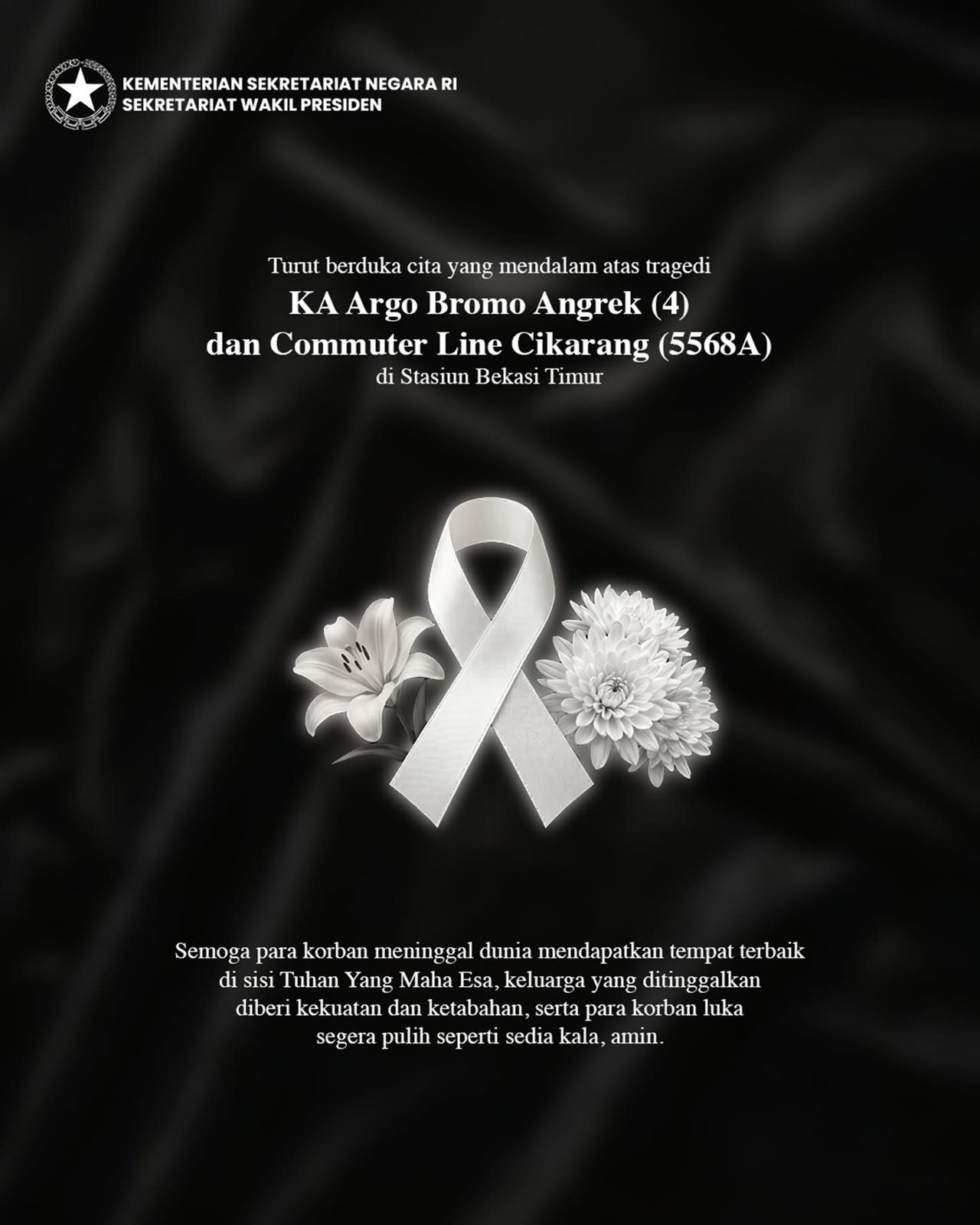 JAKARTA, Barometer99.com – Wakil Presiden RI Gibran Rakabuming Raka menyampaikan duka cita mendalam atas musibah kecelakaan yang melibatkan Kereta Api Argo Bromo Anggrek (4) dan Commuter Line Cikarang (5568A) di kawasan Stasiun Bekasi Timur.