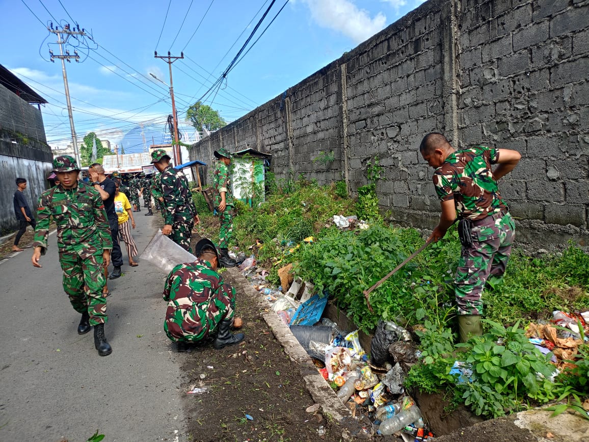 Kodim 1310/Bitung dan Yonif TP 916/BS bersama Warga Gelar Karya Bakti Pembersihan Kompleks Kanopi Bitung