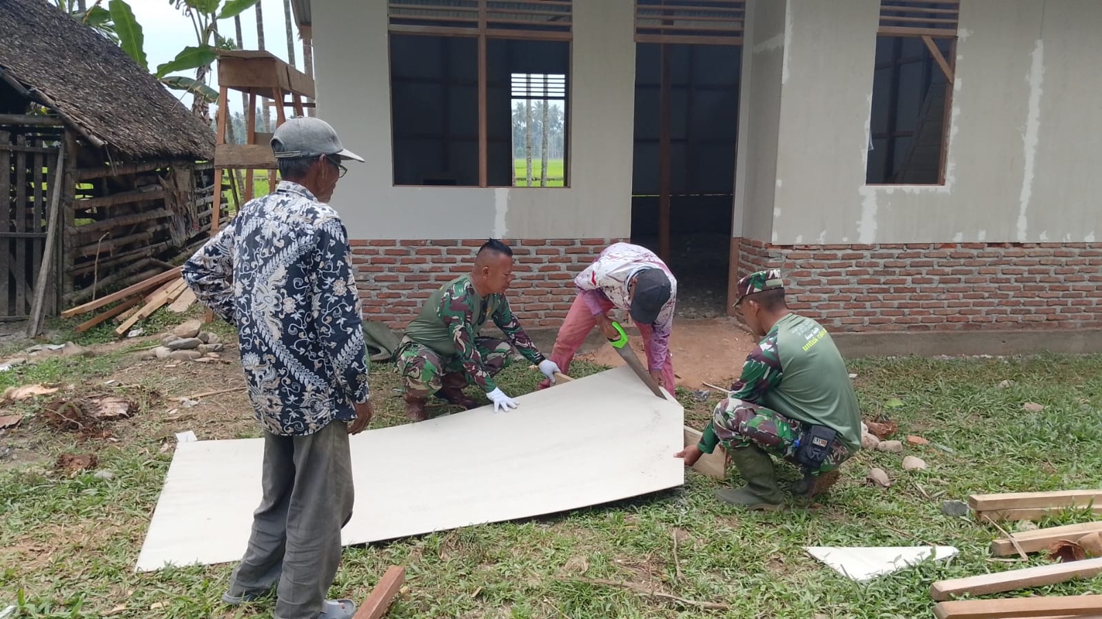 Danramil 15/Mtk, Kapten Inf Mhd Saibani, memimpin langsung para Babinsa yang dengan cekatan mengolah material bangunan di lokasi. Kerja keras para prajurit terlihat saat mereka bahu-membahu memotong dan memasang papan calsiboard sebagai dinding rumah, serta melakukan pendempulan untuk memastikan bangunan rapi dan kokoh. Sinergi di lapangan ini mencerminkan kemanunggalan TNI dengan rakyat yang terus terjaga kuat di wilayah Matangkuli.
